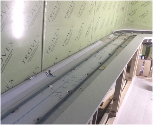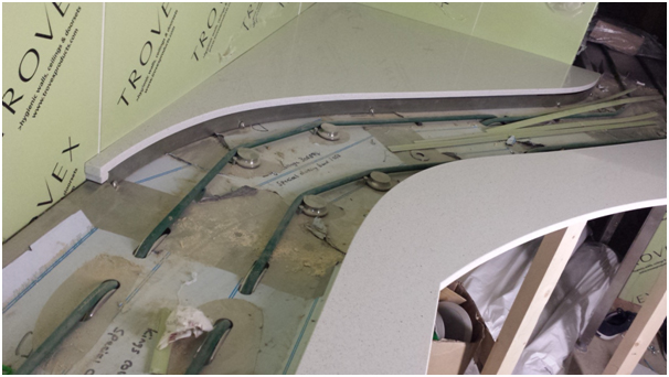 My Kitchen Worktop produced a 20mm thick white quartz surfaces with a contoured silhouette which was installed around the room in question. Manufacturing of the surfaces included curved shaping of all worktops which allow for the installation food conveyor belt.