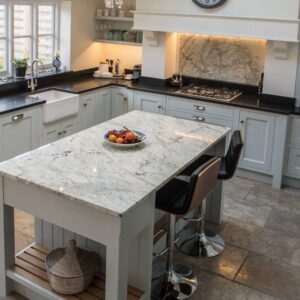 Andromeda White granite from Sri Lanka, presents swirly patterns on a white surface with delicate hints of beige and red dots over it.