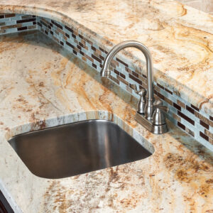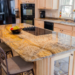 Atlantis granite is a yellow natural stone with medium to coarse grains in yellowy-orange hues that offer a striking material to any interior or exterior project.