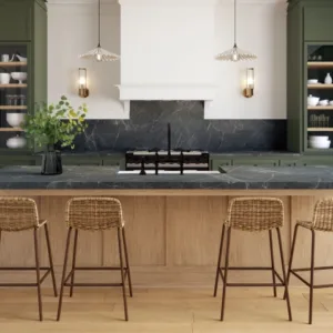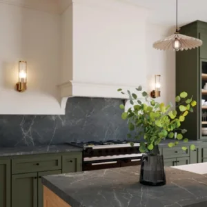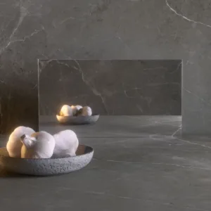 Dark greys blend with warm brown accents, in an intricate array heightened by tiny flecks and oxidisation effects that capture the aesthetic impurities of natural stone, while white organic veins mixed with finer chalky lines give direction and dramatic impact, in a Honed finish.