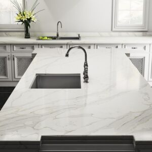 Calacatta Santa Quartz brings a classic subtle vein in light grey on a clean white backdrop.