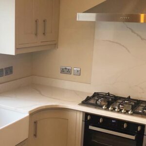 Calacatta Vegle brings multiple grey amd golden veins with dynamism over the white quartz stone surface.
