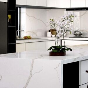 Calacatta Volcano brings multiple grey veins with dynamism over the white quartz stone surface.