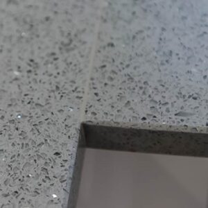 Platino Gris offers a dark grey quartz stone surface with metallic inserts scattered over the surface.
