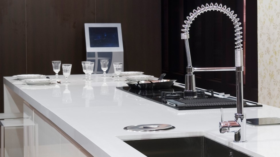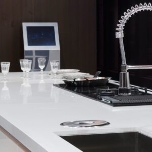 Compac Glaciar is a white quartz stone with faint white flecks that allows for versatile designs.