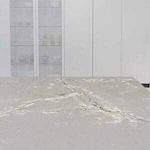 Compac Ice White quartz is a unique material created in collaboration with renowned designer Arik Levy by the Spanish manufacturer who keeps revolutionizing the quartz surface market . Compac Ice White displays a glassy white background and explosive white veins with a depth never seen before.