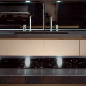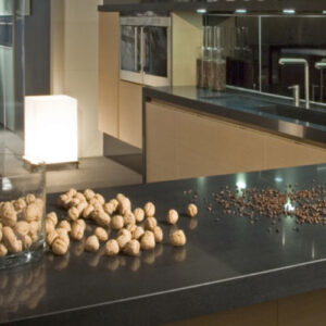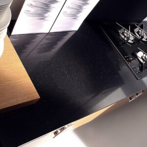 Compac Nocturno is a black quartz stone with elegant white flecks scattered around its surface offering a non-porous stone surface with a luxurious feel to any space in which it is applied.