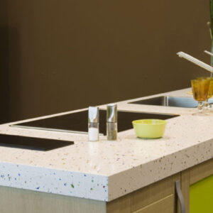 Compac Venezia is a white stone with scattered glass crystals in different colours. It offers both the beauty of Terrazzo and the practicality of quartz.