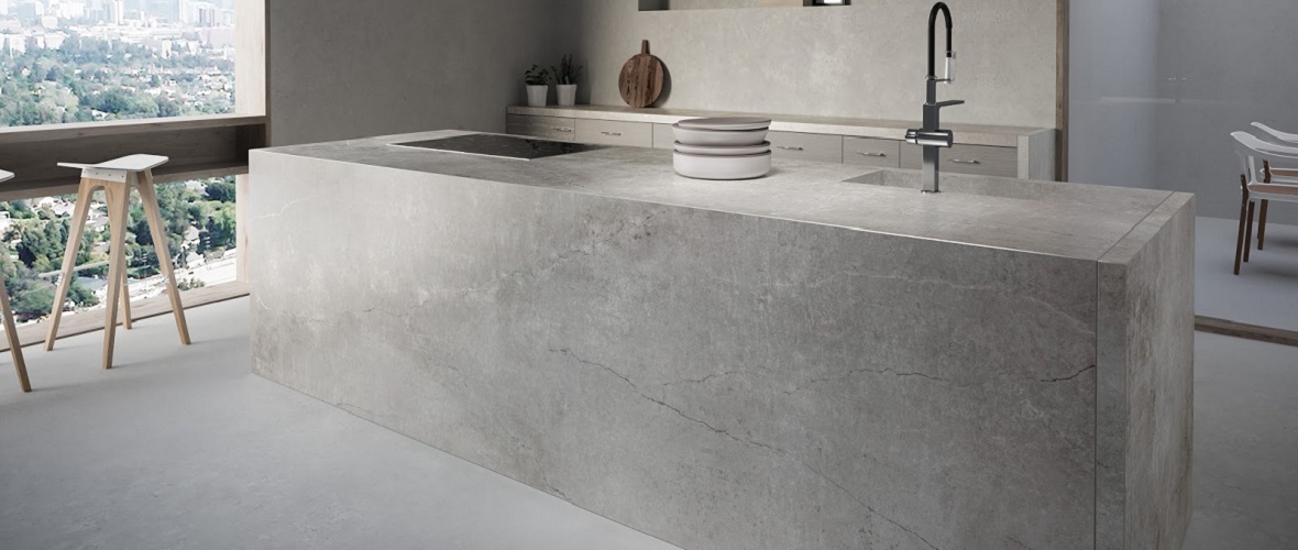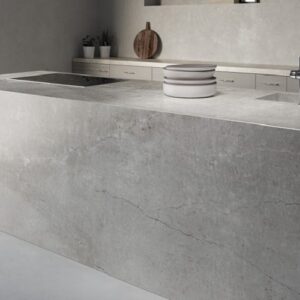 Kreta offers a light grey surface with the appearance of traditional concrete and cement materials. In contrast to these building products, the material is non-porous and it doesn’t require sealants.