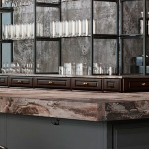 Dekton Orix is an ultracompact surface by Cosentino which belongs to the Industrial Collection launched in 2017. It evokes the organic variation of cement stone, narrating the natural decay of the material which suits industrial designs and architectural spaces.