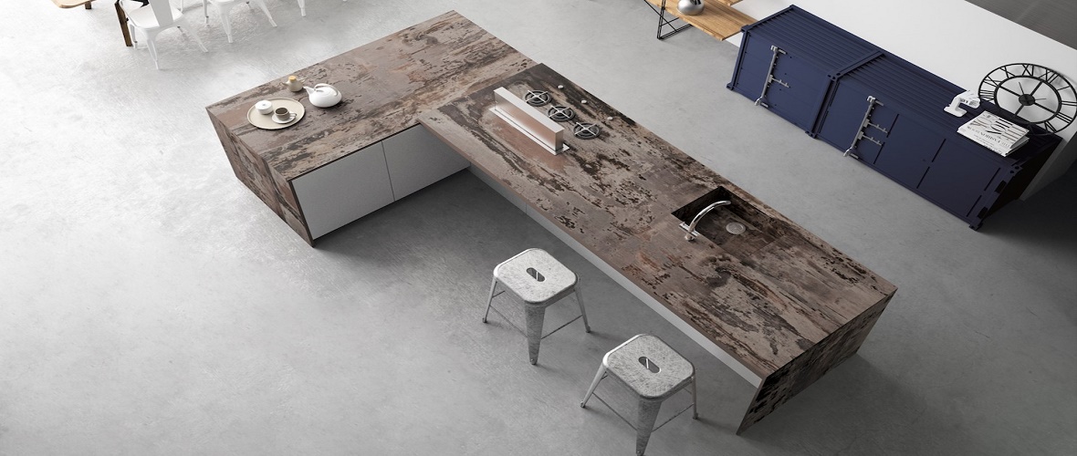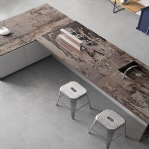 Dekton Trilium is a brown sintered material that was conceived with the premise of bringing an industrial, rusty look to interior and exterior designs. It presents a combination of shades of brown, greys and black; resulting in an oxidized effect that is velvety at when touched. It is a prime product that has an incredibly realistic representation of natural materials and finishes.