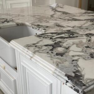 Dover White quartzite is also known as Dover White granite. It is a natural stone from the north of Brazil that presents a compelling palette of greyish veins and swirls, and a subtle silver shimmer that flow in a beautiful mineral combination.