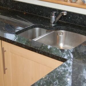 A dark granite with large semi precious blue and silver flecks. Very popular and appealing in any enviroment