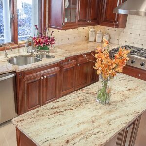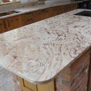 A light golden yellow granite with a flowing pattern of tiny brown spots