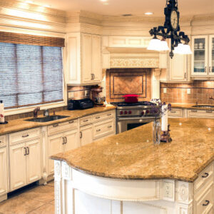A golden yellow granite with a flow-like pattern of yellow and brown veins