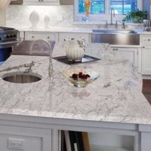 Meera White Granite offers an opaque white backdrop with minerals and fine grains in beige, and black spots scattered over its surface.