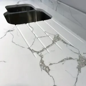 Opal Calacatta Gold is inspired by Italian natural marble. The surface displays grey veins in random patterns with golden hints, contrasting a glorious white backdrop. It provides the natural marble look without the worry of getting stains or scratches.