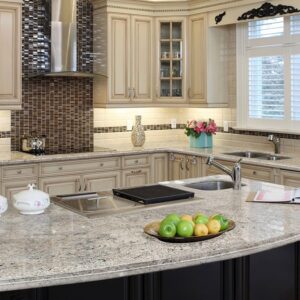 Romano White granite is a natural stone from Brazil that presents an ivory white base with veins and minerals ranging in white and grey in combination with random intrusions of copper scattered over its surface.