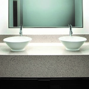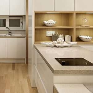 Beige quartz worktop from Samsung Radianz with black flecks and brown/cream translucent chips throughout.