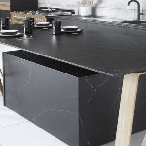Silestone Charcoal Soapstone is a reinterpretation of real soapstone which becomes splotchy very easily, but made out of quartz which means it is easy to maintain and does not require sealing and does not bring any issues associated to natural soapstone.
