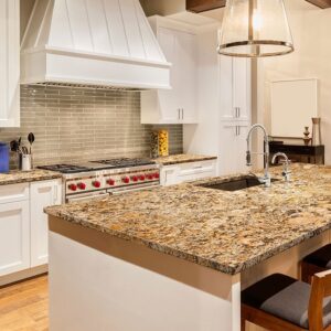 A very busy yellow granite consisting of white, brown, black, and beige colors.
