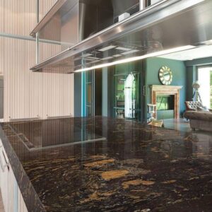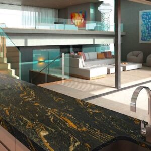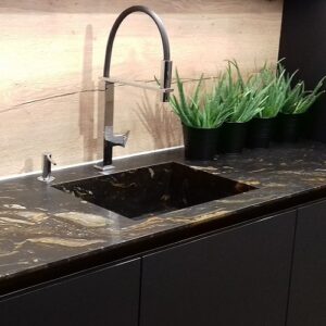 Stromboli stands out for its black colour combined with golden veins, which carries you away to far-off landscapes. Discover Naturamia Stromboli Granite.