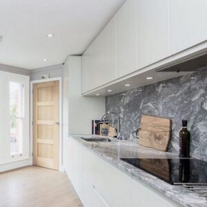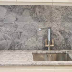 Superwhite quartzite is an exotic stone original from the north of Brazil. It is characterized by large granules and striking grey veins with wild patterns on its surface.