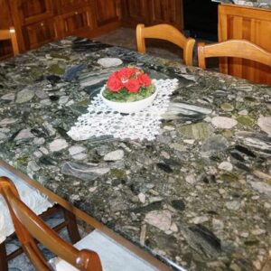 An exquisite granite formed deep beneth the earths crust. It is a conglomerate of green, grey and white pebbles held within a black granite.